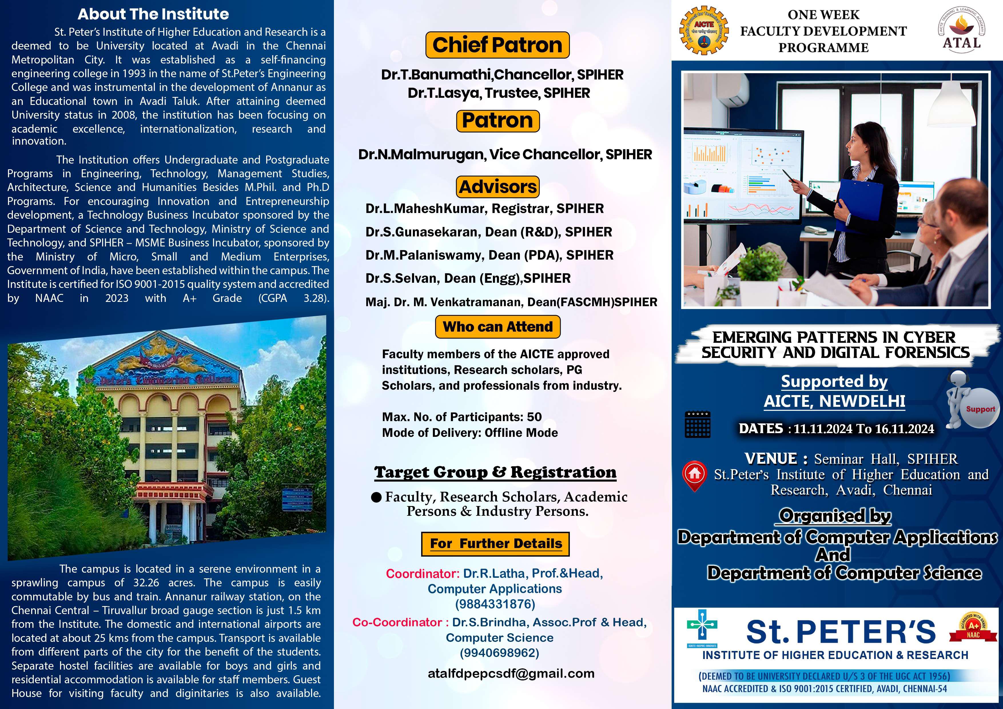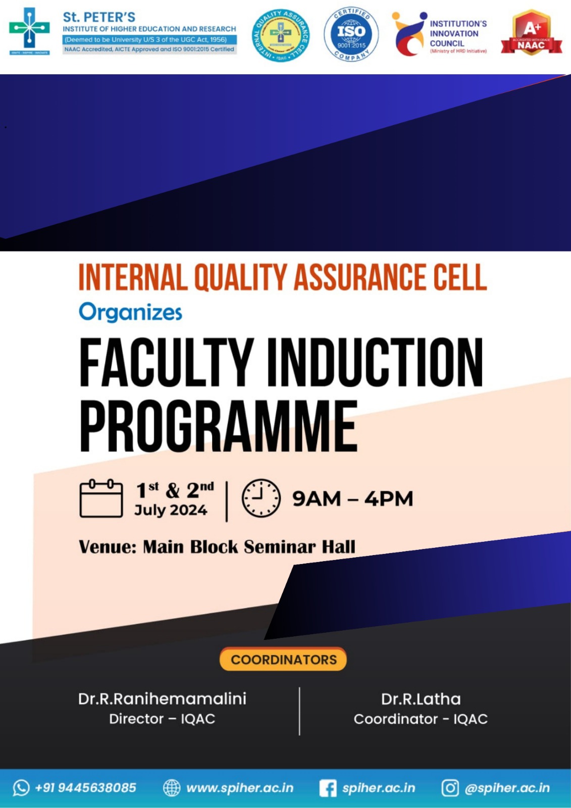 SPIHER is a Deemed to be University under section 3 of UGC Act, 1956 since 2008. The institution was previously known as St.Peter’s Engineering College which was established in the year 1993. It is one of the India’s leading Institute, with students from all over the country. The institution continuously strives to focus on imparting quality technical education and introducing innovative programmes leading to Research and Development for sustainable growth. The institution offers Engineering, Technology, Architecture, Management Studies, Science and Humanities programmes approved by UGC and AICTE.